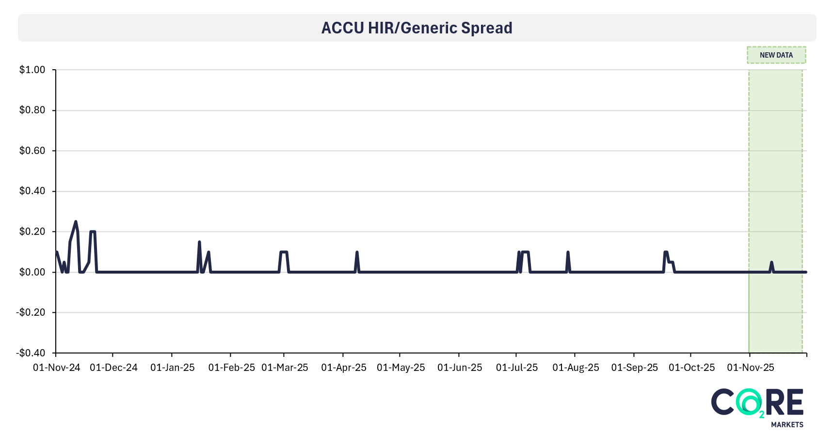 • The ACCU market softened through November, with generic spot prices easing into the $36 to $38 range as broader sentiment weakened in response to both domestic compliance season dynamics and external shocks from the New Zealand ETS.