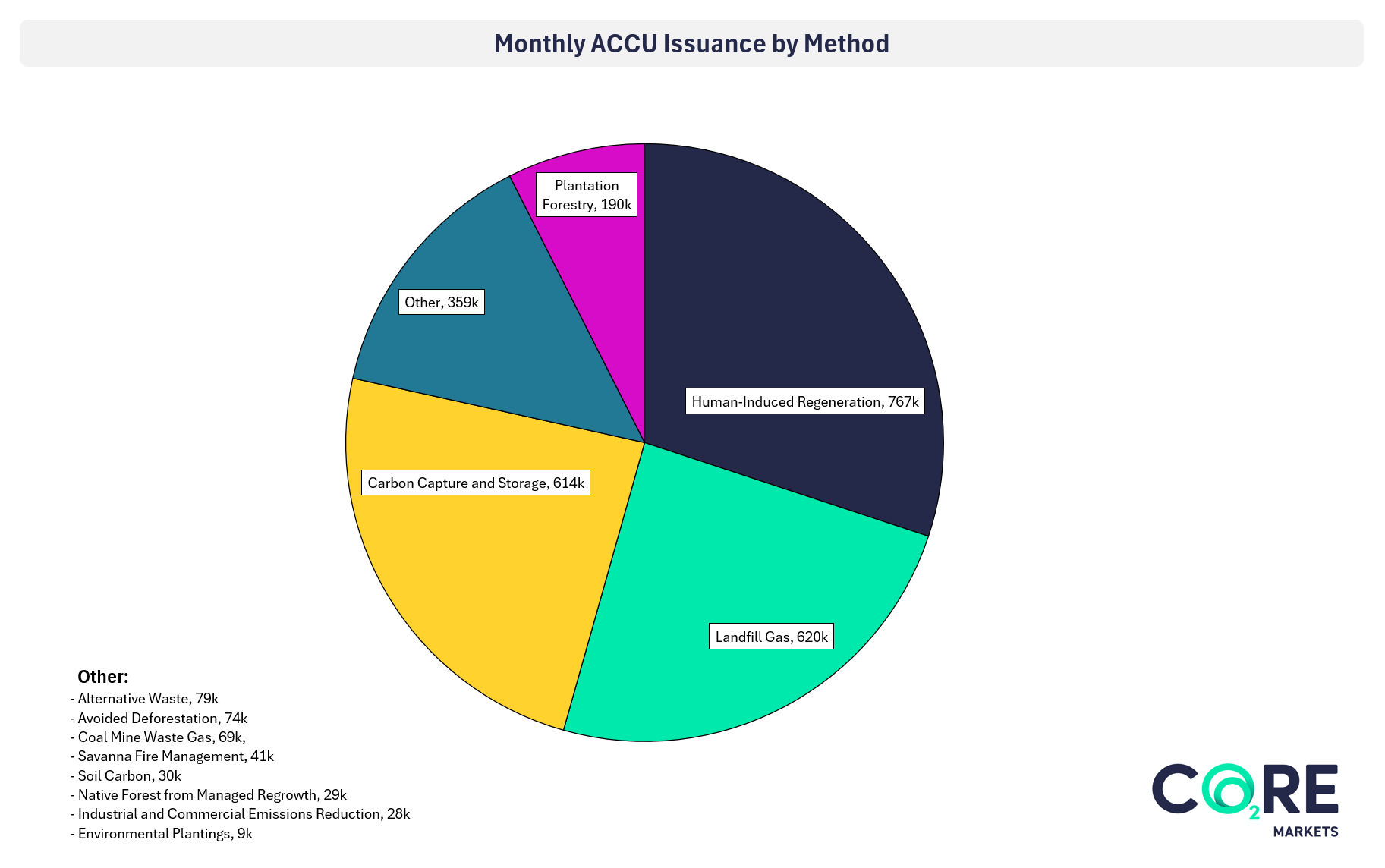 • Additionally, 614k Carbon Capture and Storage ACCUs were issued in the month by Santos and Beach Energy’s Moomba CCS project – the single highest monthly issuance for any project in the history of the scheme.