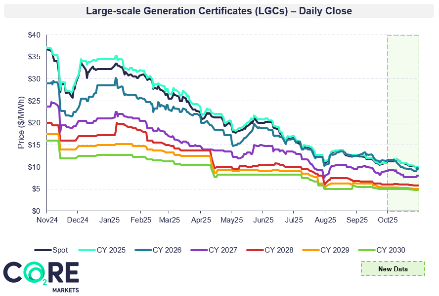 LGC prices continued to ease through October as surplus supply remains priced into 2030, while STCs stayed firm on strong creation under the Federal Battery Rebate Scheme. VEEC and ESC markets remain active, with participants watching new activity types and tightening supply pipelines ahead of next surrender deadlines. The sharp PRC target cut has constrained creation opportunities and dampened confidence in new project activity.
