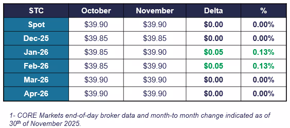 The LGC market continued its downward trend in spot and forward prices throughout November, reflecting ongoing weakness in the value of LGCs generated from both existing and upcoming renewable assets through to 2030.